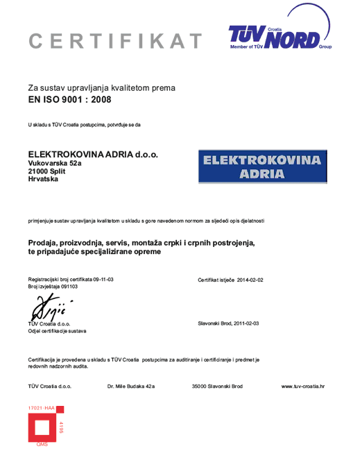 Tvrtka "ELEKTROKOVINA ADRIA" uskladila je i certificirala svoje poslovanje sukladno standardu: EN ISO 9001:2008.
